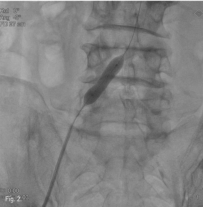 Fig. 2. Balloon expandable stent (10mm x 29mm) was deployed at right common iliac artery.