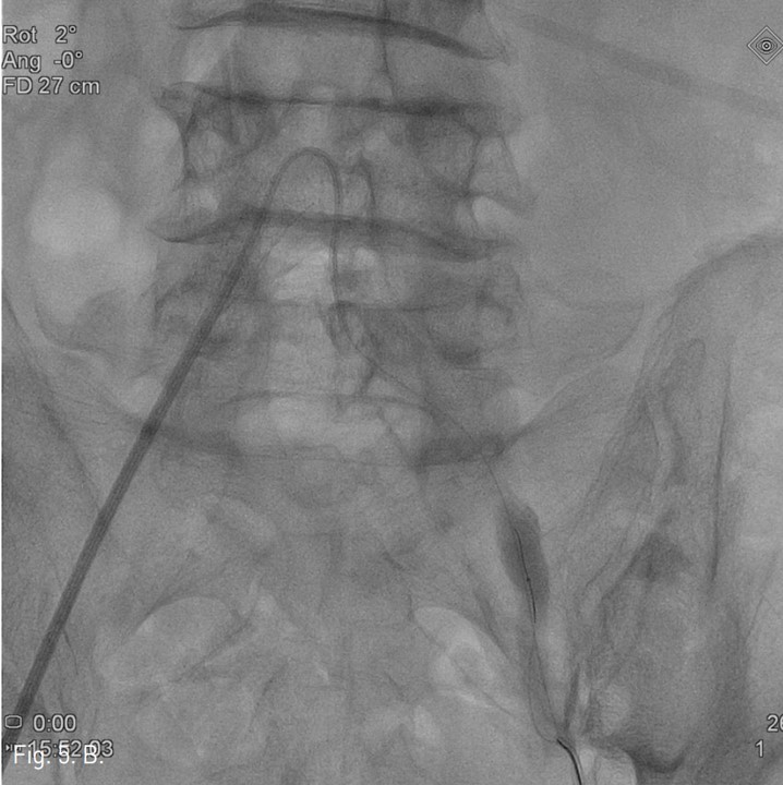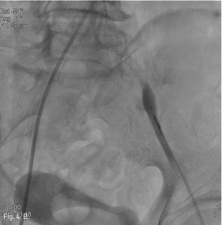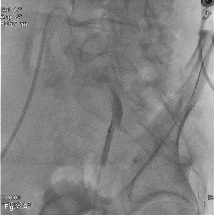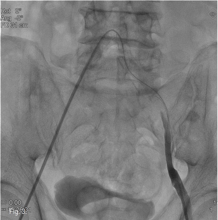 좌즉 arterial sheath내부로 outback device를 전진하여 ‘L-자’ 표시를 확인하고, tube를 90도 회전하여 'T-자’ 표시를 확인한 후, outback device의 바늘로 천자 후 0.014 inch Trenscend guide wire(Boston scientific, Miami, USA)를 가성내강 내로 진입시켰지만 좌측 총장골동맥과 외장골동맥의 경계부위 부터 대동맥으로 진입되지 않았다.