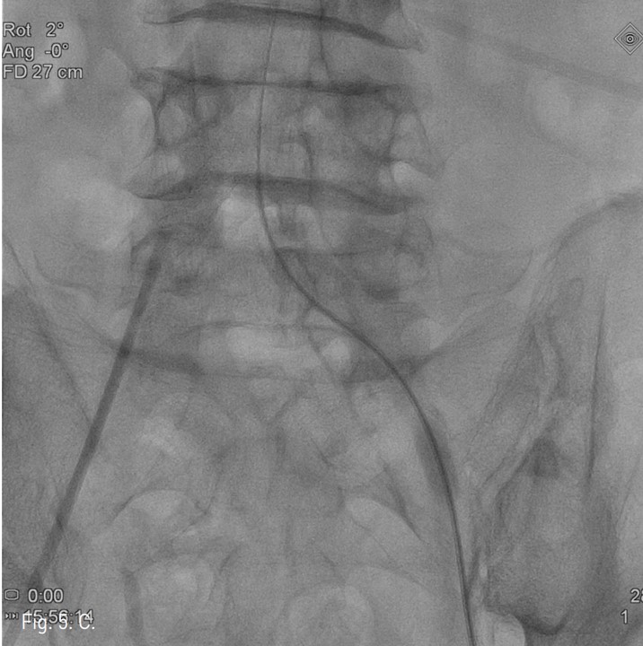 우측 arterial sheath를 통하여 좌측 총장골동맥의 기시부에 Simmon catheter(A&A M.D., Seongnam-si, Korea)를 위치시키고 0.035 inch guide wire (Terumo, Tokyo, Japan) 로 폐쇄부위 통과를 시도하였으나 가성내강에서 진성내강으로 재진입이 되지 않았다.