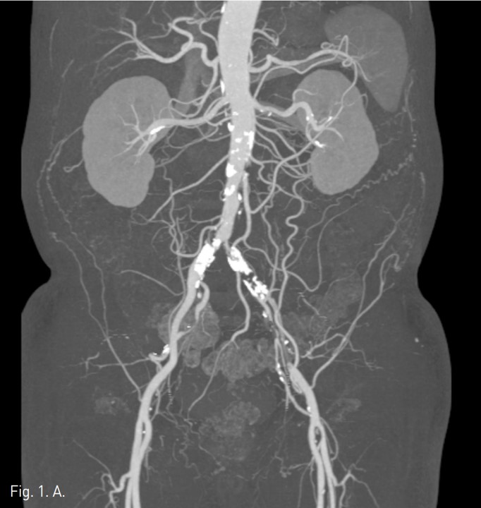 컴퓨터단층촬영 혈관조 영술과 고식적 혈관조영술에서 우측 총장골동맥에 석회화를 동반한 80%정도의 심한 협착이 있고, 좌측 총장골동맥에서 외장골동맥에 석회화를 동반한 완전 폐쇄의 소견이 있다 (Fig. 1A, IB). 우총대퇴동맥의 근위부에 10mm x 29mm Zenesis stent를 설치하였다 (Fig. 2). 0.035 inch guidewire로 좌측 총장골동맥의 기시부 폐쇄부위 통과를 시도하였으나 가성내강에서 진성내강으로 재진입이 되지 않았다 (Fig. 3). 좌측 외장골동맥 진성내강 내에 있는 ‘L-자’ 표시방향의 outback device가 보인다 (Fig. 4A), 좌측 외장골동맥 진성내강 내에 있는 'T-자’ 표시방향의 outback device가 보인다(Fig. 4B). Outback device를 이용하여 동맥내막을 천자후 0.014 inch guidewire를 가성내강 내로 진입시켰지만 좌측 총장골동맥-외장골동맥경 계부위에서 더 이상 진행되지 않았다 (Fig. 4C). 0.014 inch guidewire를 따라서 Davis catheter를 가성내강 내로 진입시키고 (Fig. 5A), 10mm snare를 삽입하여 Simmon catheter내부에 있던 microwire를 전진시켜 snare로 잡아 좌측 sheath로 뽑아내어 (Fig. 5B), 5Fr. Davis catheter를 대동맥 내부로 진입시켰다(Fig. 5C). 양측 총장골동맥 및 좌측 외장골동맥 스텐트 설치후 대동맥장골동맥조영술상에서 양측 장골동맥의 완전한 재개통을 보인다 (Fig. 6).