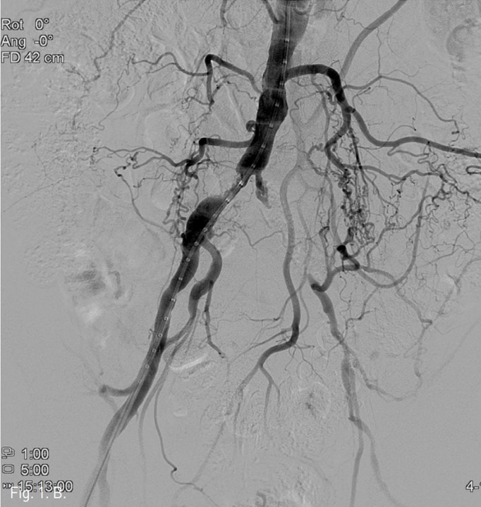 초음파 유도하에 양측 총대퇴동맥을 역방향 천자하고 7Fr. arterial sheath를 삽입한후 pigtail catheter (Cordis, Miami Lakes, FL, USA)를 이용하여 대동맥장골동맥조영술을 시행하여 우측 근위부 총장골동맥의 80%정도의 협착과 좌측 근위부 총장골동맥의 완전폐쇄를 확인하였다. 이어 우총대퇴 동맥의 심한 협착에 대하여 10 mm x 29 mm (deploy시 25 mm) Zenesis stent (Cordis)를 설치하였다.