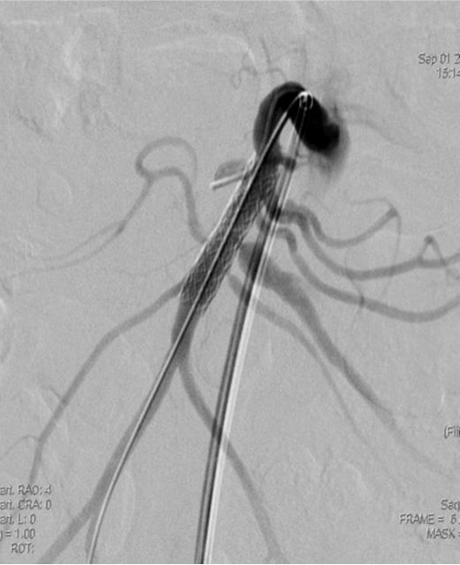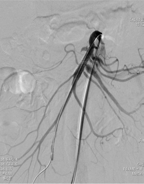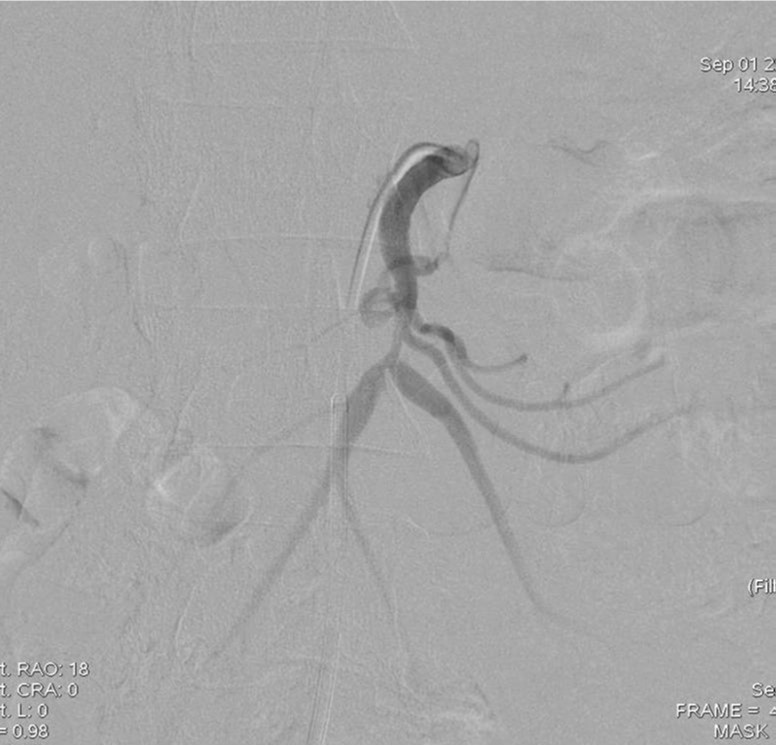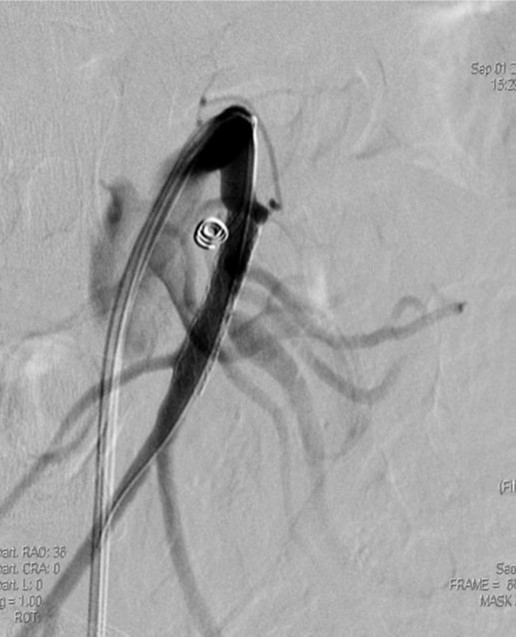 스텐트 설치 후 협착은 소실되었으나 pseudoaneurysm은 소실되지 않고 크기만 작아짐. 스텐트의 철망을 통해 2.4 Fr microcatheter(Progreat, Terumo, Tokyo, Japan)를 pseudoaneurysm내에 위치시킨 다음 5mm microcoil (Cook, Bloomington, IN) 1개를 삽입함. 시술 후 시행한 혈관 조영술에서 SMA 협착과 pseudoaneurysm은 완전히 소실되었으며 추적 관찰기간 동안 재발 소견은 보이지 않음.