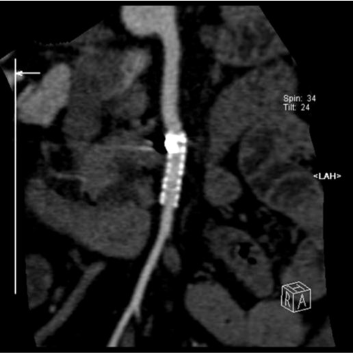 2009년 3월 복부 CT에서 SMA 기시부 하방 2cm 부위부터 5cm 길이의 편심성 혈전이 관찰되고 있으며 혈전이 있는 부위의 동맥 직경이 커져 있음(Fig. 1). 대동맥이나 분지 동맥에 동맥경화증의 소견은 관찰되지 않으며 심장초음파 및 심전도 검사에서 혈전이나 심방 세동은 없었음. CT 소견과 증상을 기준으로 spontaneous isolated SMA dissection으로 진단하였으며 창자의 허혈 소견이 보이지 않고 통증도 악화되지 않아 보존적 치료를 하였음. 2009년 6월 추적 CT에서 false lumen내 대부분의 혈전은 소실되었으나 SMA 기시부 5cm 하방 부위에는 국소적 혈전을 동반한 saccular pseudoaneurysm이 관찰됨. 2009년 8월 시행한 추적 CT에서 pseudoaneurysm의 직경이 2mm 증가함 (Fig. 2). 2009년 9월 시행한 혈관 조영술에서 saccular pseudoaneurysm이 SMA 기시부 5cm 하방부위에 관찰되며 SMA의 국소적 협착이 관찰됨 (Fig. 3). 스텐트와 코일을 이용한 혈관 내 치료 후 시행한 혈관 조영술에서 SMA의 국소적 협착과 pseudoaneurysm은 소실됨 (Fig. 4). 시술 3개 월 후 시행한 추적 CT에서 pseudoaneurysm은 완전히 소실되었으며 SMA는 정상소견을 보임(Fig. 5).