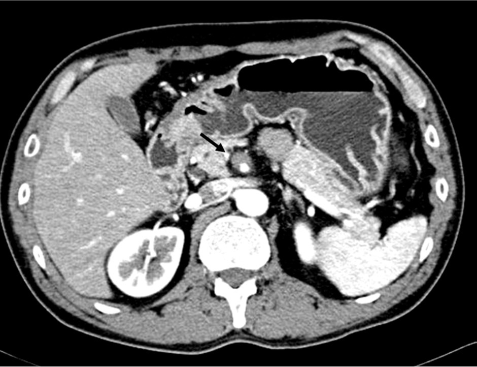 Fig. 1. Enhanced CT scan shows eccentric thrombosis in the superior mesenteric artery at the levrd of transition zone from a fixed segment under the pancreas to the mobile segment at the mesenteric root.