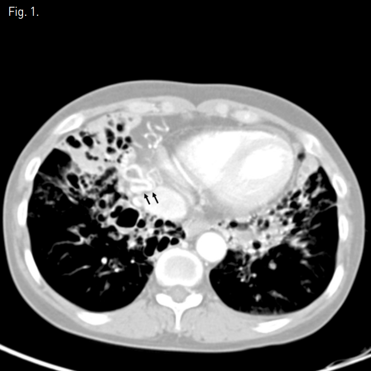 흉부 CT에서 양측 하엽과 우중엽에 기관지 확장증이 있으며 굵어져 있는 기관지동맥 및 우측 아래횡격막동맥이 관찰된다(Fig. 1). 대동맥조영술에서도 기관지동맥 및 우측 아래횡격막동맥이 굵어져있다(Fig. 2).