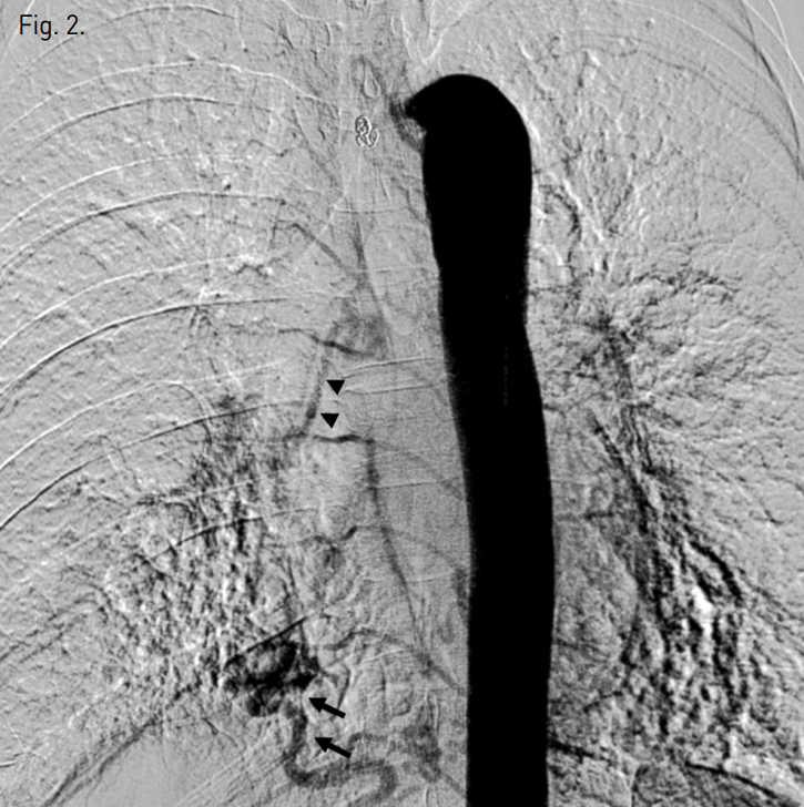 Aortogram shows engorged right bronchial artery (arrowheads) and right inferior phrenic artery (arrows).