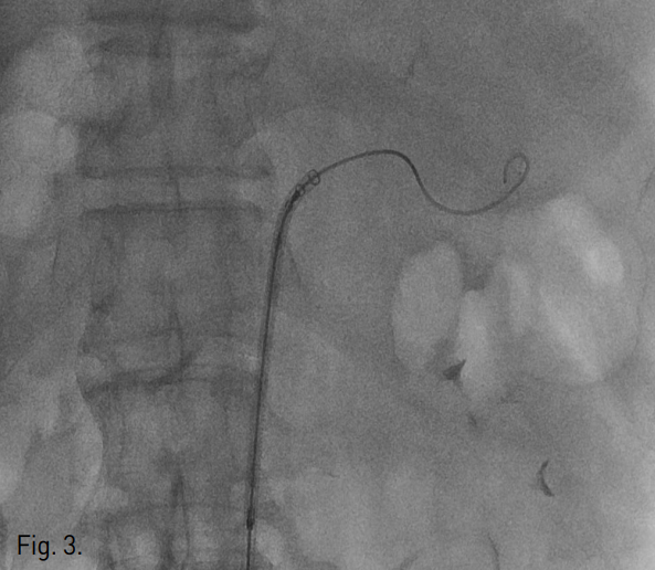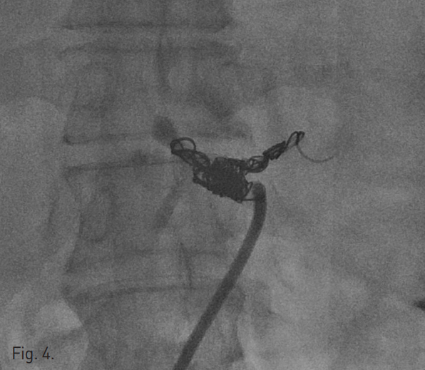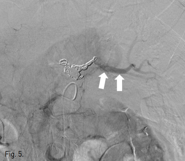 본 환자에서는 좌위동맥은 결찰된 상태였고, 단위동맥이 기시하는 비장동맥을 색전하였으나 잔류 위의 경색은 발생하지 않았다. 본 환자에서 색전술 후 시행한 상장간막동맥 조영술 상에서 원위 비장동맥의 혈류가 약하게나마 확인된 바, 송 등은 배측췌장동맥(dorsal pancreatic artery)의 횡행 경로가 복강동맥과 상장간막동맥의 측부 순환에서 중요한 역할을 할 수 있음을 보고하였다(5). 본 환자에서도 이러한 측부 순환이 잔류위의 경색을 막는 역할을 하였을 것으로 생각된다.