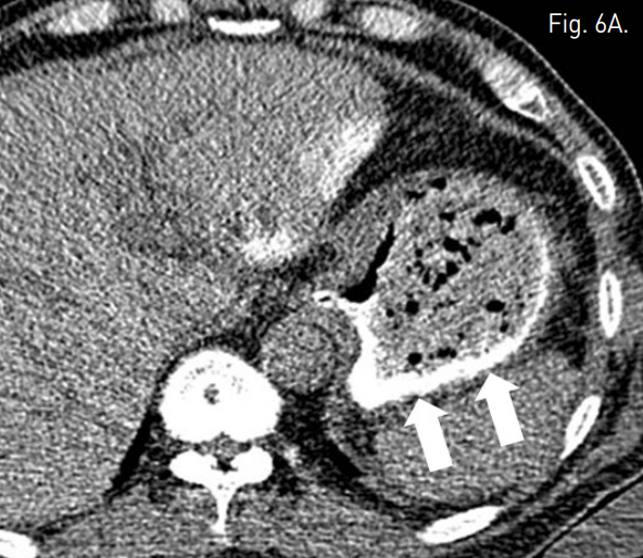 A. Non-enhanced CT scan performed 12 hours after embolization shows stagnation of contrast media in the stomach wall (arrows).