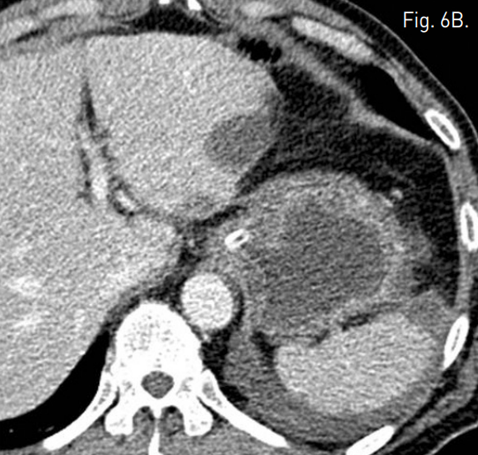 B. Contrast-enhanced CT scan which was performed 7 days after embolization shows improved perfusion of stomach wall.
