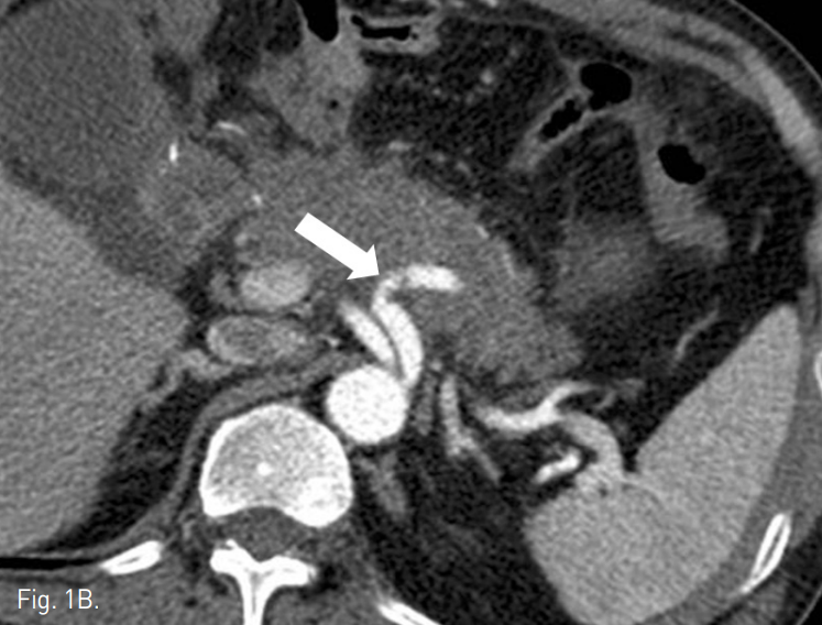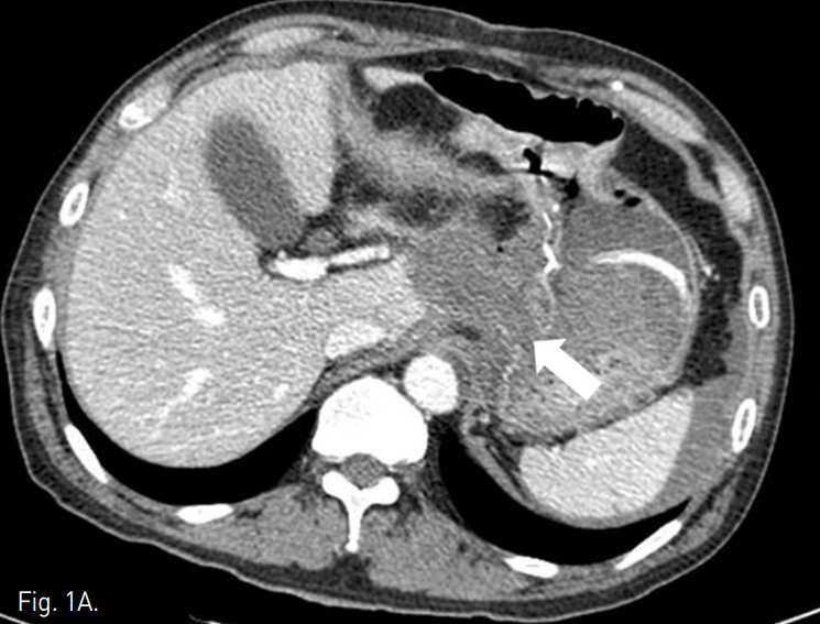 조영증강 복부 CT에서 잔류위의 점막부 조영증강이 일부 끊어져 있는 소견이 보였고, 그 주변으로 혈종과 액체저류 소견이 보여 잔류위 봉합부의 열개(dehiscence)가 있는 것으로 생각된다(Fig. 1a). 액체저류는 주변으로 파급되어 췌장을 둘러싸고 퍼지는 양상이며 비장동맥 주위까지 침윤되어 있었다. 비장동맥의 근위부가 약간 불규칙하게 보였으나 급성 출혈이나 가성동맥류 소견은 뚜렷하지 않았다(Fig. 1b).