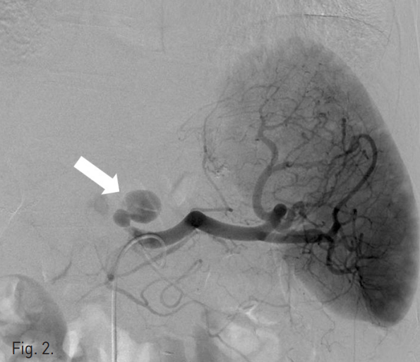 Splenic arteriogram shows a pseudoaneurysm (arrow) arising from left gastric artery stump which is originated from proximal splenic artery.