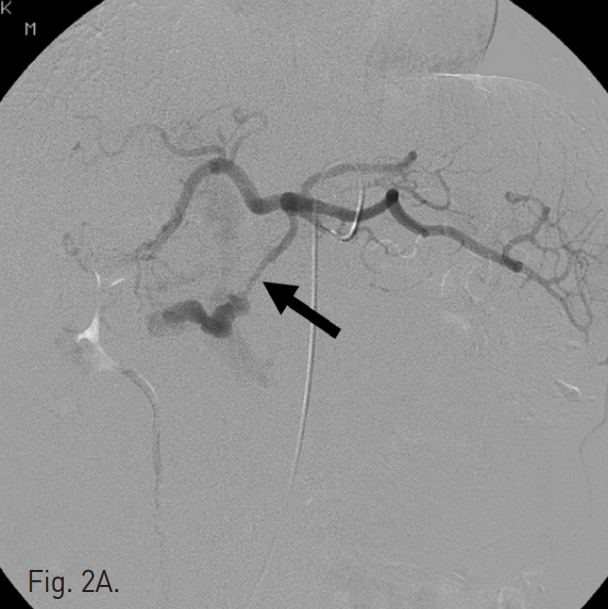 내원 후 시행한 조영증강 복부CT에서 10cm 크기의 혈종과 dorsal pancreatic artery의 거짓동맥류가 있음. 또한 초기 동맥기 사진에서 상장간막 정맥과 문맥이 조영되는 동정맥루(arteriovenous fistula)가 확인됨 (Fig. 1).