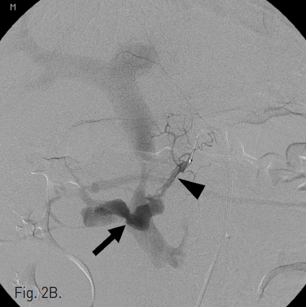 B. Seective angiography of dorsal pancreatic artery (arrow head) shows pseudoaneurysm and arteriovenous fistula to superior mesenteric vein. Por tal vein is visualized erly due to fistulation (arrow).