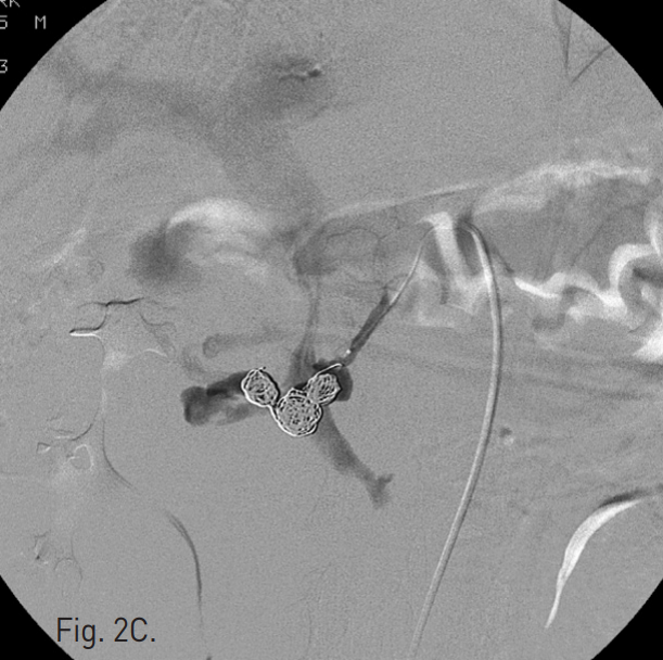 초음파 및 투시 하에서 우측 대퇴동맥을 천자하고 5F Cobra catheter(Cook, Bloomington, IN, USA)를 이용하여 복강동맥 및 상장간막동맥 조영술을 시행하였다. 복강동맥 조영술에서 dorsal pancreatic artery에서 유출되는 조영제의 누출과 거짓동맥류를 확인하였고 상장간막 정맥으로의 동정맥루를 확인하였다(Fig. 2A, B). Microcatheter(Renegade, Boston Scientific, Natick, MA, USA)를 이용하여 이 거짓동맥류를 선택하였고, 10mm Interlock coil(Boston Scientific, Natick, MA, USA) 6개와, 10mm Nester coil(Cook, Bloomington, IN, USA) 3개를 사용하여 embolization을 시행하였다(Fig. 2C). 이후 남아있는 거짓동맥류와 동정맥루에 대하여 NBCA와 lipiodol mixture(3:1)를 이용하여 색전술을 시행하였다. 시술 후 동맥조영술에서 남아있는 거짓동맥류나 상장간막 정맥으로의 동정맥루는 보이지 않았다(Fig. 2D).