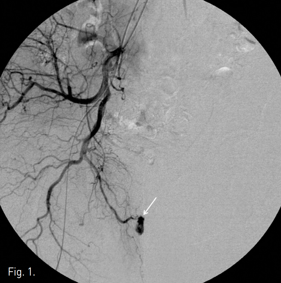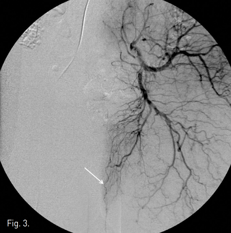 Right internal iliac angiogram shows an arterio-cavernous fistula at the distal portion of a branch of the right internal pudendal artery (arrow).