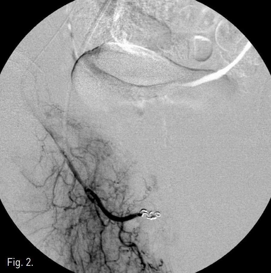 우측 총대퇴동맥을 천자한 후, 5F sheath(Terumo, Tokyo, Japan)를 거치 시켰다. 이후 0.035 inch guide wire(Terumo, Tokyo, Japan) } 5F pigtail catheter(Cook, Bloomington, IN, USA)를 이용하여 골반동맥 조영술을 시행하였으며, 우측 internal pudendal artery에서 기시하여 corpora cavernosa로 유입되는 arterio-cavernous fistula가 관찰되었다. 2.2F microcatheter(Progreat; Terumo, Tokyo, Japan)를 통해 superselection한 후 tornado coil (Cook, Bloomington, IN, USA)을 이용하여 색전을 시행하였다. 색전술 후 우측 internal pudendal artery 조영술상 더 이상 arterio-cavernous fistula는 관찰되지 않았다.