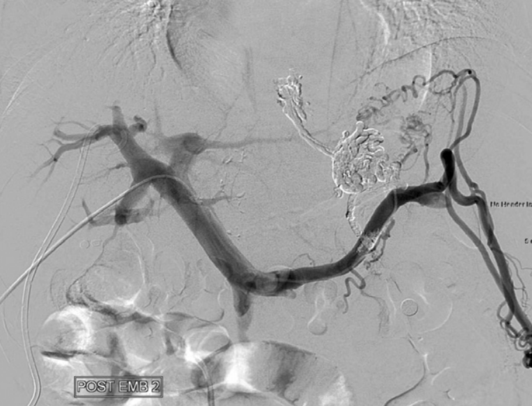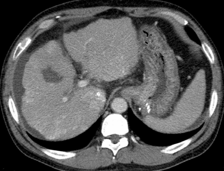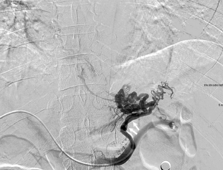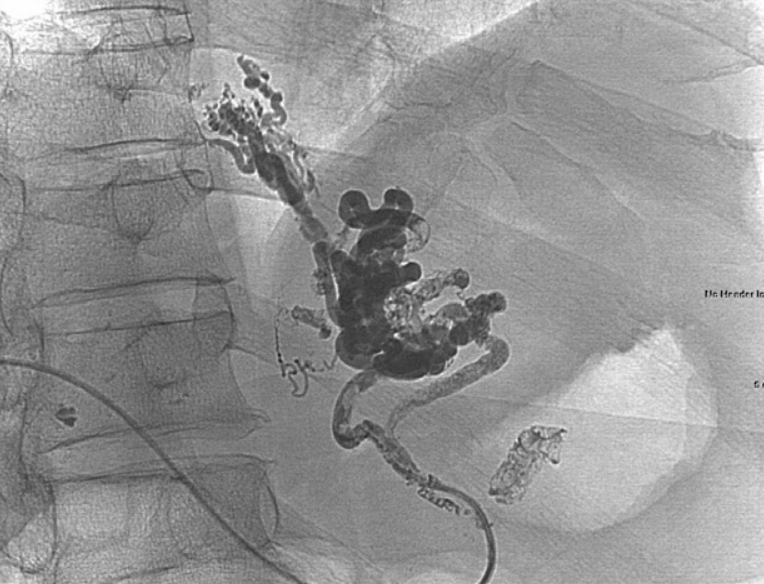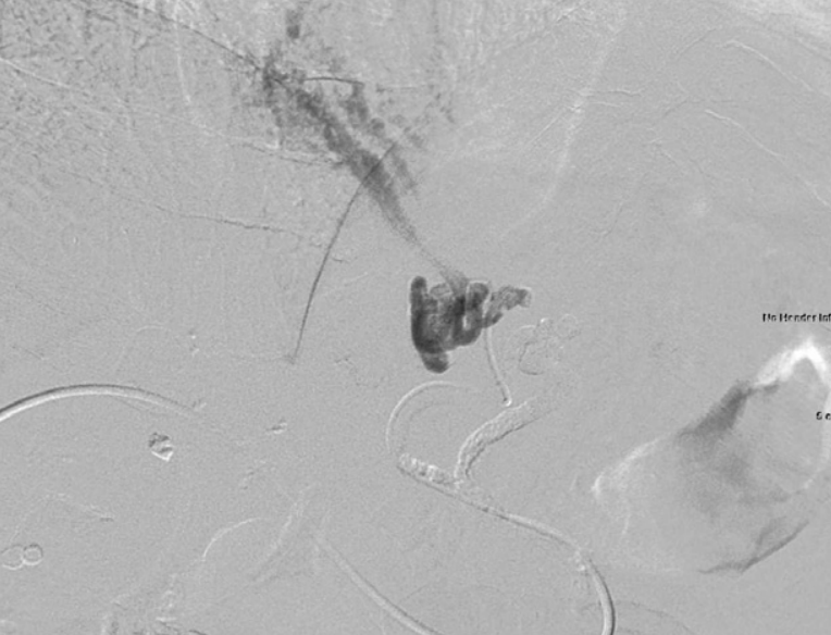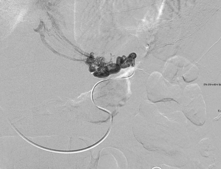 간경화에 의한 식도정맥류출혈에 대해 내시경적 결찰술을 1회 받았던 환자로 하루 전부터 발생한 토혈을 주소로 내원함. 내시경 검사에서 식도와 위분문부 정맥류가 관찰되었고 위분문부 정맥류에서 출혈이 있어 결찰술을 시행했으나 실패하였음. CT에서 gastrorenal shunt가 보이지 않아 BRTO를 시행할 수 없었고 정맥류의 경피경간적 폐쇄술이 의뢰되었음.