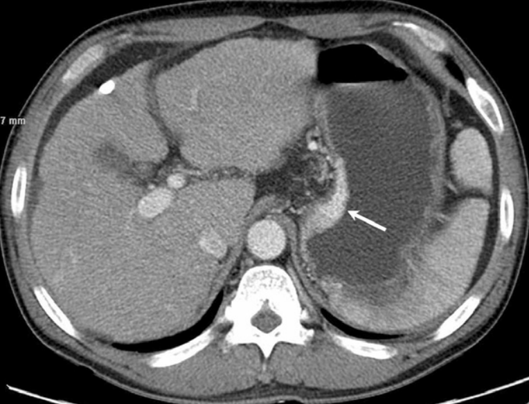 Enhanced CT scan demonstrates gastric cardiac varices (arrow).