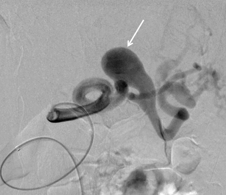 Splenic arteriogram shows tortuous splenic artery. The largest aneurysm (arrow) is 2.2cm in size and originated from the distal portion of the splenic artery.