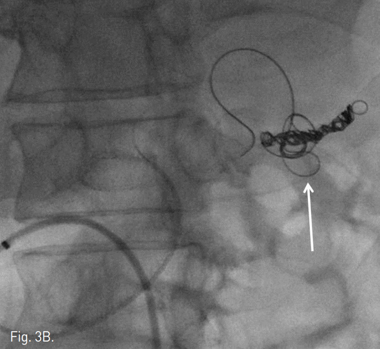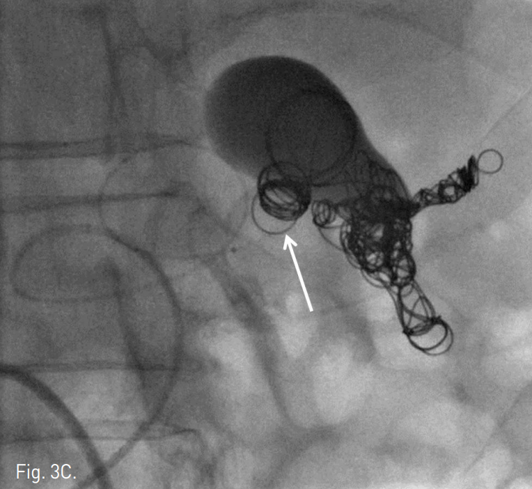 우측 대퇴동맥을 천자하여 6F Curved shuttle sheath(Cook, Bloomington, IN)를 이용하여 복강동맥을 선택한 후 시행한 동맥조영술에서 사행성의 비장동맥이 관찰되었고 이에서 기원한 동맥류가 관찰이 되었다(Fig. 2). 0.035-inch 유도철사(Terumo, Tokyo, Japan)를 이용하여 5F Cobra 카테터(Cook, Bloomington, IN)를 비장동맥의 동맥류 근위부까지 접근한 후 카테터 내부로 2.4F Renegade microcatheter(STC, Boston Scientific, Japan)와 Fathom guidewire(Boston Scientific, Japan)를 삽입하였다. 이를 이용하여 색전술을 시행할 동맥류 내강을 지나 동맥류에서 기원한 비장동맥의 한 가지를 선택하였고(Fig. 3A) 그 가지에 interlocking detachable coil(IDC,Vortex, Boston Scientific, Japan)을 이용하여 anchoring technique.으로 동맥류보다 원위부 비장동맥과 동맥류의 목부분에 색전술을 시행하였다 (Fig. 3B). 미세카테터의 위치를 옮겨 동맥류의 내강 일부와 동맥류의 근위부 혈관을 micronester pushable coil(Cook Medical, Bloomington, IN)과 IDC (Vortex, Boston Scientific, Japan)를 사용하여 색전시켰다(Fig. 3C). 동맥류 내강은 더 이상 조영제가 차지않고 비장동맥의 원위부 및 비장은 다른 측부 순환에 의해서 조영이 되는 것을 확인 후 시술을 종료하였다(Fig. 4).
