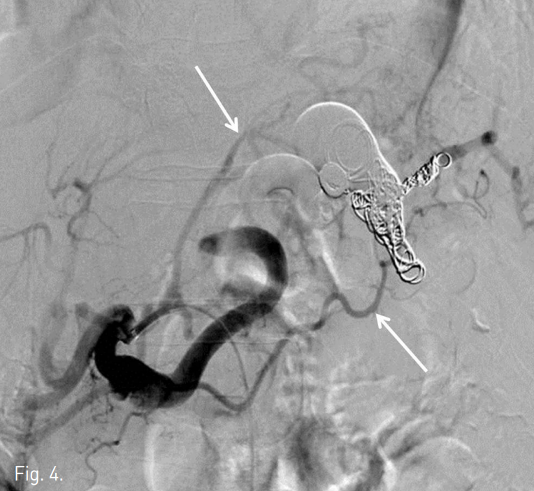 Post-embolization arteriogram shows complete embolization of the aneurysmal sac. Distal part of the splenic artery is opacified through collateral flow (arrow).