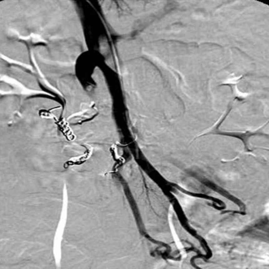 All of small collateral veins are successfully embolized using 2.4F microcatheter and multiple microcoils and completion portal venogram shows the varix and its afferent veins are not opacified.