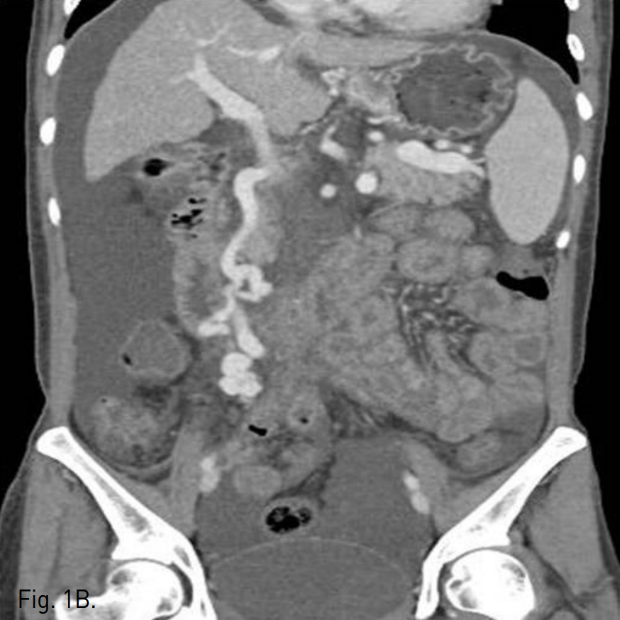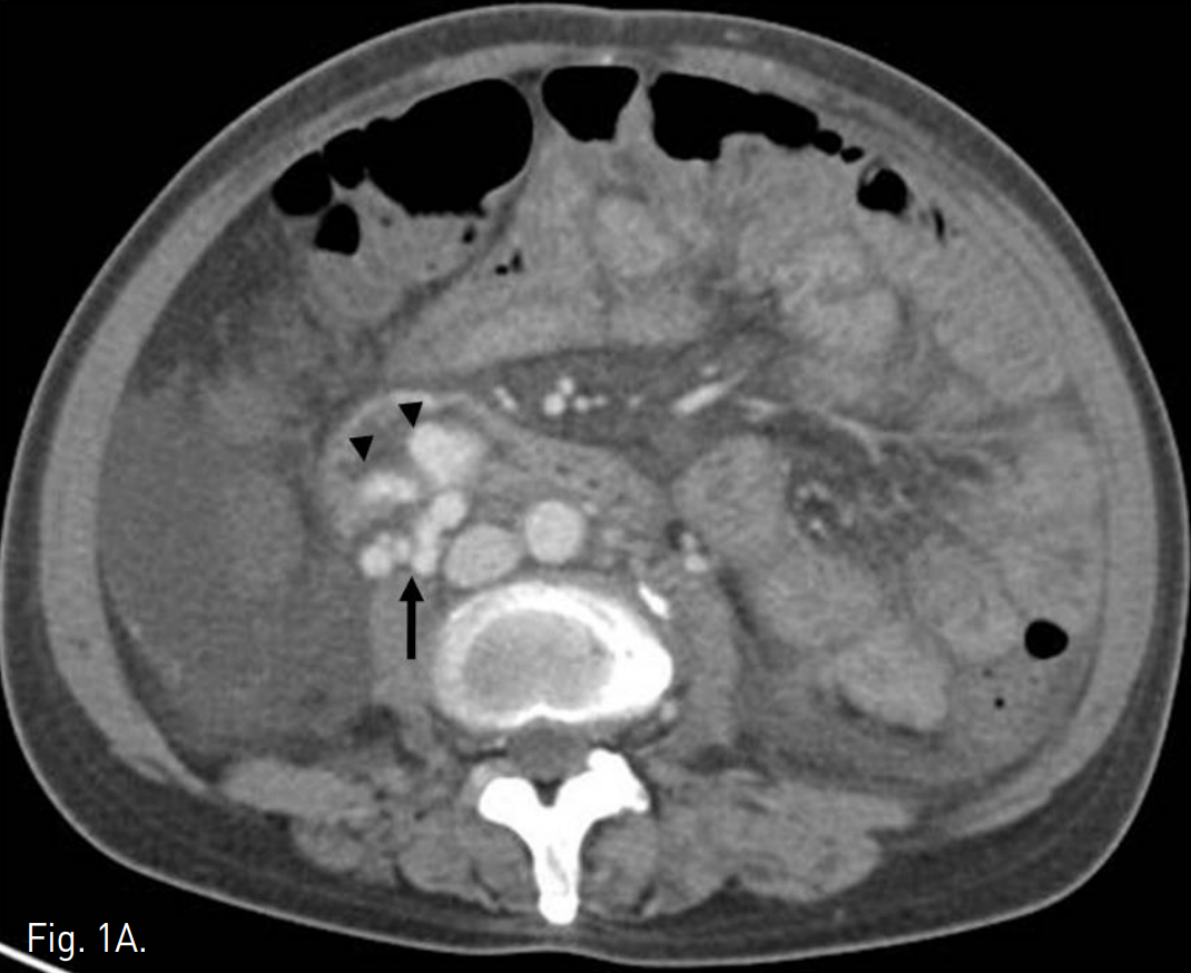 복부 CT에서 정맥류로 생각되는 확장되고 구불구불한 모양의 이상 혈관구조가 주문맥 윈위부에서 기시하여 우하복부 장간막을 따라 있으며, 일부 혈관구조가 소장 벽에 노출되어 있는 모습을 보인다. 그 외에 위, 식도에도 정맥류가 관찰되고 복수와 간 표면의 불규칙화, 경한 비장종대, 소장의 점막하부종이 동반되어 있다(Fig. 1A, B).