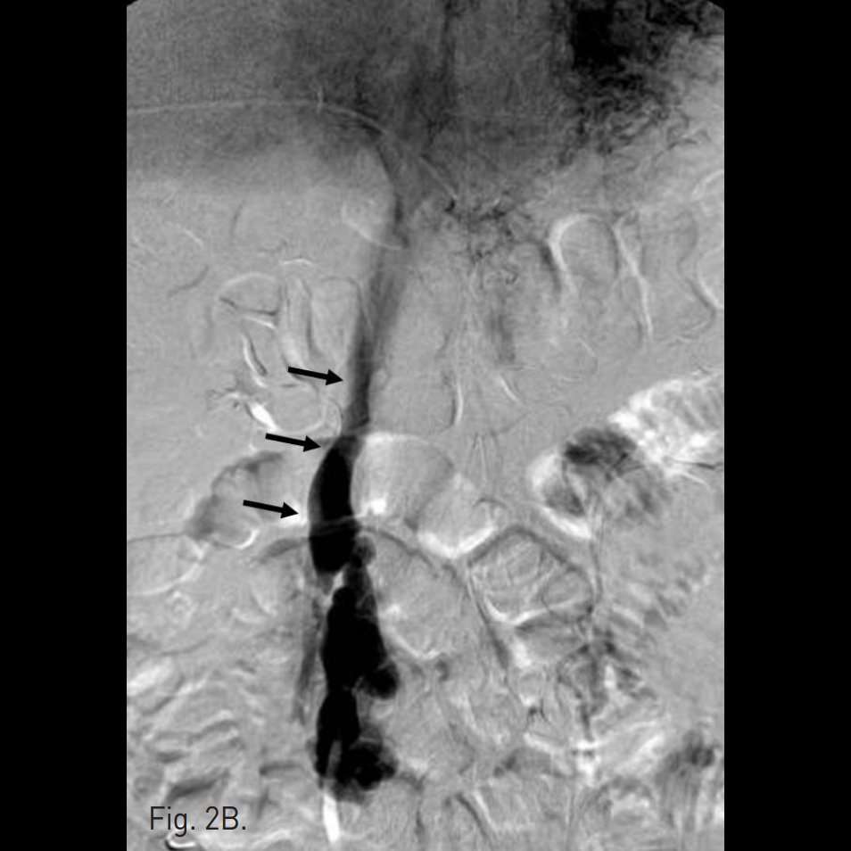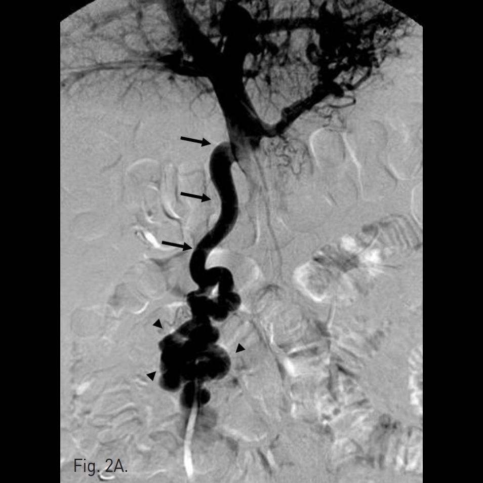 우후간문맥(right posterior portal vein)을 경피적으로 천자하여 6F sheath를 삽입하고 5F curved diagnostic cahteter를 상장간막정맥(superior mesenteric vein, SMV)에 위치시킨 뒤 시행한 direct portal venogram에서 주문맥(main portal vein)의 원위부에서 기시하는 비후된 혈관이 관찰되고 jejunal varix와 연결되어 있으며, 주문맥으로부터 다량의 혈류가 이 혈관으로 역류하고 있음(Fig. 2A). Varix의 nidus로부터 기시하는 drainage veins가 다수 관찰되고, 그 중 varix의 기시부에서 하대정맥으로 직접 유출되는 다량의 혈류가 있음(Fig. 2B).