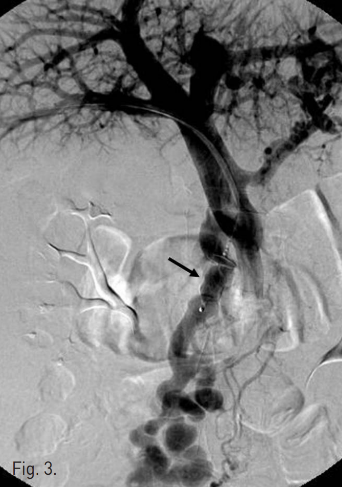 최종적인 direct portal venogram에서 더 이상의 varix가 관찰되지 않음(Fig. 5). 이후 portal vein puncture tract을 microcoils로 폐쇄 후 시술 종결함. 환자는 2주 후 퇴원시까지 더 이상의 장출혈 소견 보이지 않아 퇴원함.