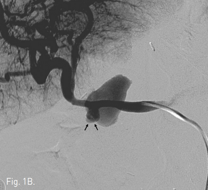 B. Common hepatic arteriogram shows the pseudoaneurysm (arrows) and extravasation of constrast material.