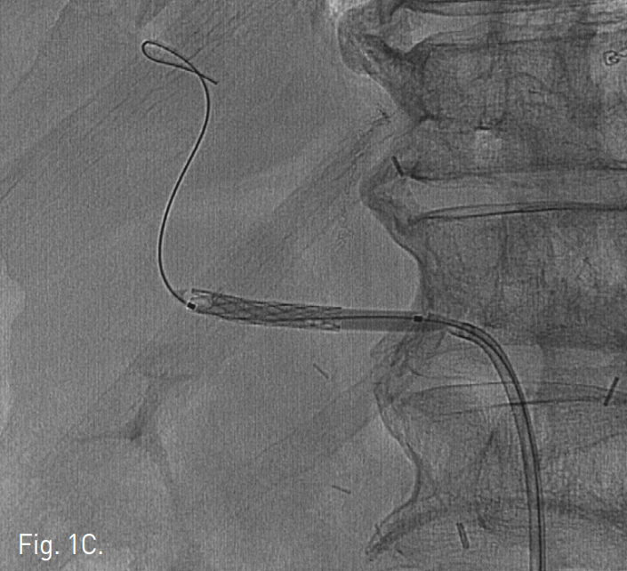 우측 대퇴동맥을 천자하여 복강동맥 조영술을 시행하여 가성동맥류의 크기와 위치를 확인하고 stent-graft를 설치하고자 하였다. 8F guiding catheter (Launcher, Medtronics Inc, Minneapolis)를 복강동맥 입구에 위치시키고 직경 4-9mm, 길이 28mm의 말초혈관용 stent graft(Jostent, Abbott, Germany) 를 직경 4mm, 길이 40mm balloon(Symmetry Balloon dilatation catheter, Boston Scientific, USA)에 장착하였다. 5F angiographic catheter와 0.035" guidewire로 좌측 간동맥을 selection한 후에 exchange guidewire(18 control Wire, Boston Scientific, USA)로 교체한 후 Balloon ex pandable stent graft를 간동맥에 설치하였다(Fig. 1C). 시술 직후 시행한 복강동맥 조영술에서 가성동맥류 부위의 간동맥이 stent-graft 설치 범위에 충분히 포함되었으며 조영제 누출은 보이지 않는다(Fig. 1D).