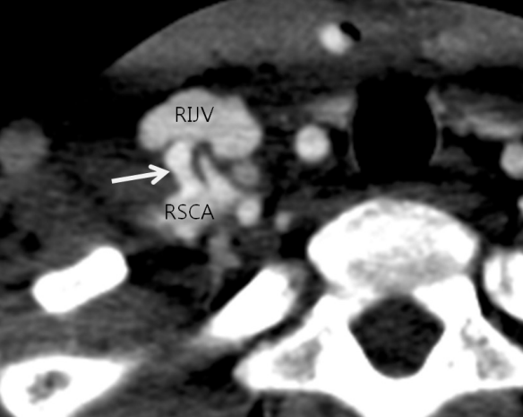 Axial image of contrast-enhanced CT scan shows arteriovenous fistular tract (white arrow) between right subclavian artery (RSCA) and right internal jugular vein (RIJV).