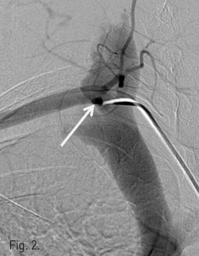 Right subclavian arteriogram shows the arteriovenous fistula (white arrow). The fistula was seen as an ovoid spot because of posteroan terior direction.