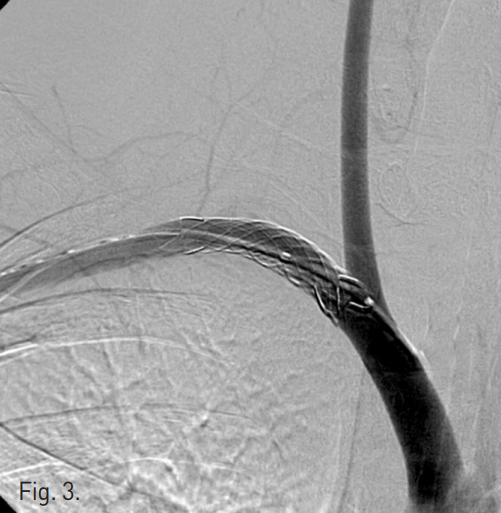 After successful stent graft placement at right subclavian artery, there was no residual blood flow through the arteriovenous fistula.