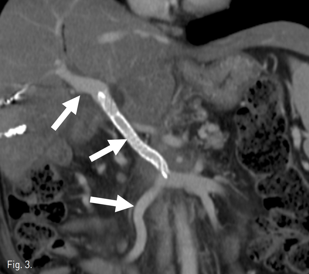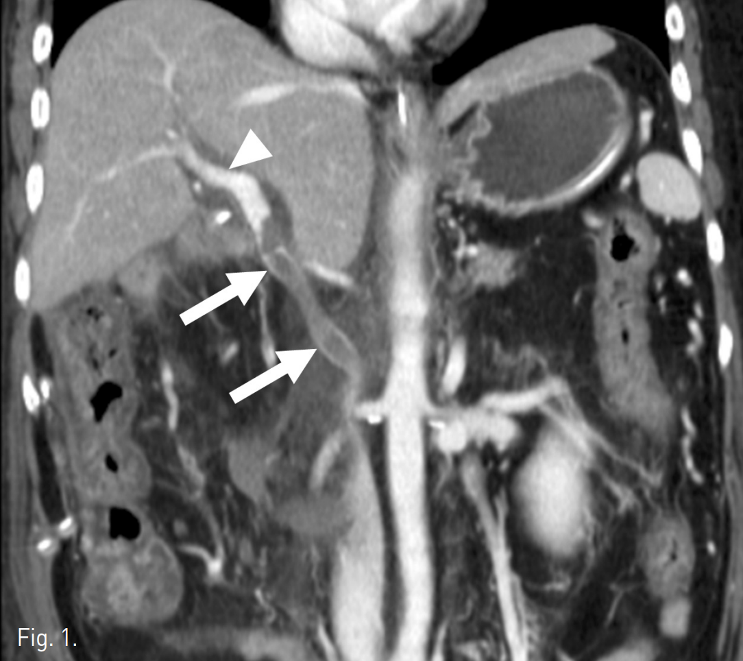 수술 후 7일째 시행한 복부 CT 문맥기에서 합성혈관(synthetic graft)이 혈전으로 막혀 있고(Fig. 1) 빈창자(jejunum)의 점막을 따라 조영 증강되는 정맥성 울혈이 보인다. 하지만 간 내 문맥의 혈류는 유지되고 있다.