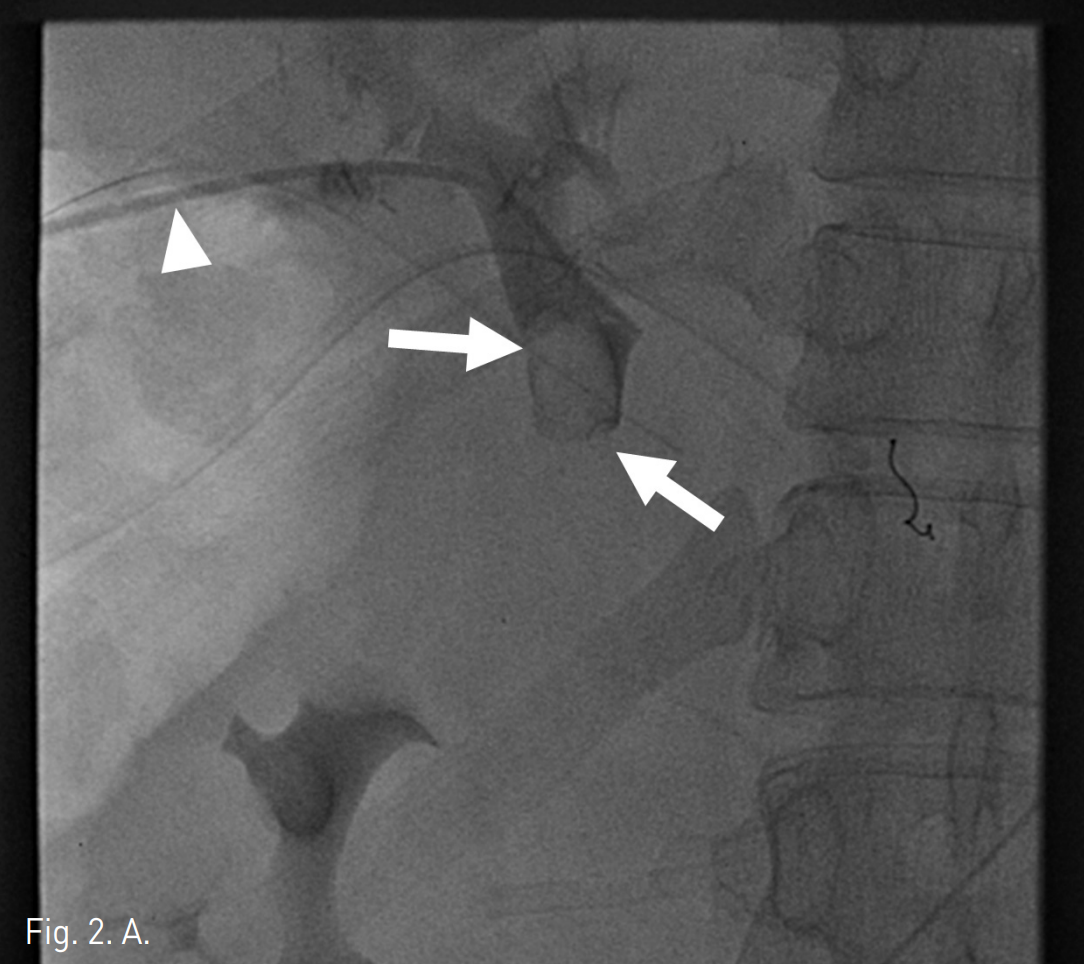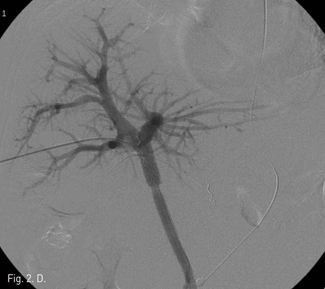 초음파 유도 하에서 우측 문맥을 20G Chiba needle을 이용해 직접 천자한 후 문맥 조영 영상에서 문맥부 합성혈관의 혈전성 폐색을 확인하였다(Fig. 2A). 5F Davis catheter (Cook, Bloomington, IN, USA)와 urokinase (200K unit)를 이용한 혈전용해술, 7F Sheath catheter (Cook, Bloomington, IN,USA)를 이용한 흡입 혈전제거술과 stent를 이용한 치료를 계획하였다. 혈전용해술 및 흡입 혈전제거술을 시행한 후 문맥의 혈류가 회복되었으나 이 과정에서 간 내 문맥(intrahepatic portal vein)에 혈전성 색전에 의한 것으로 보이는 간 내 문맥의 충만결손이 발생하였고(Fig. 2B), 이에 대해 다시 흡입혈전제거술을 시행하여 문맥의 흐름을 원활히 하였다. 이후 자가팽창형 스텐트(10mm x 80mm)(S&G biotech, Seoul, Korea)를 합성혈관의 근위부 및 원위부 접합부를 모두 포함하도록 설치하였다(Fig. 2C), 스텐트를 위치시킨 후 시행한 문맥조영술에서 간 내 문맥의 충만결손이 사라지고 스텐트 삽입 부위의 문맥의 혈류가 원활하며 출혈 등의 시술 후 부작용이 없음을 확인하고 시술을 종료하였다 (Fig. 2D).