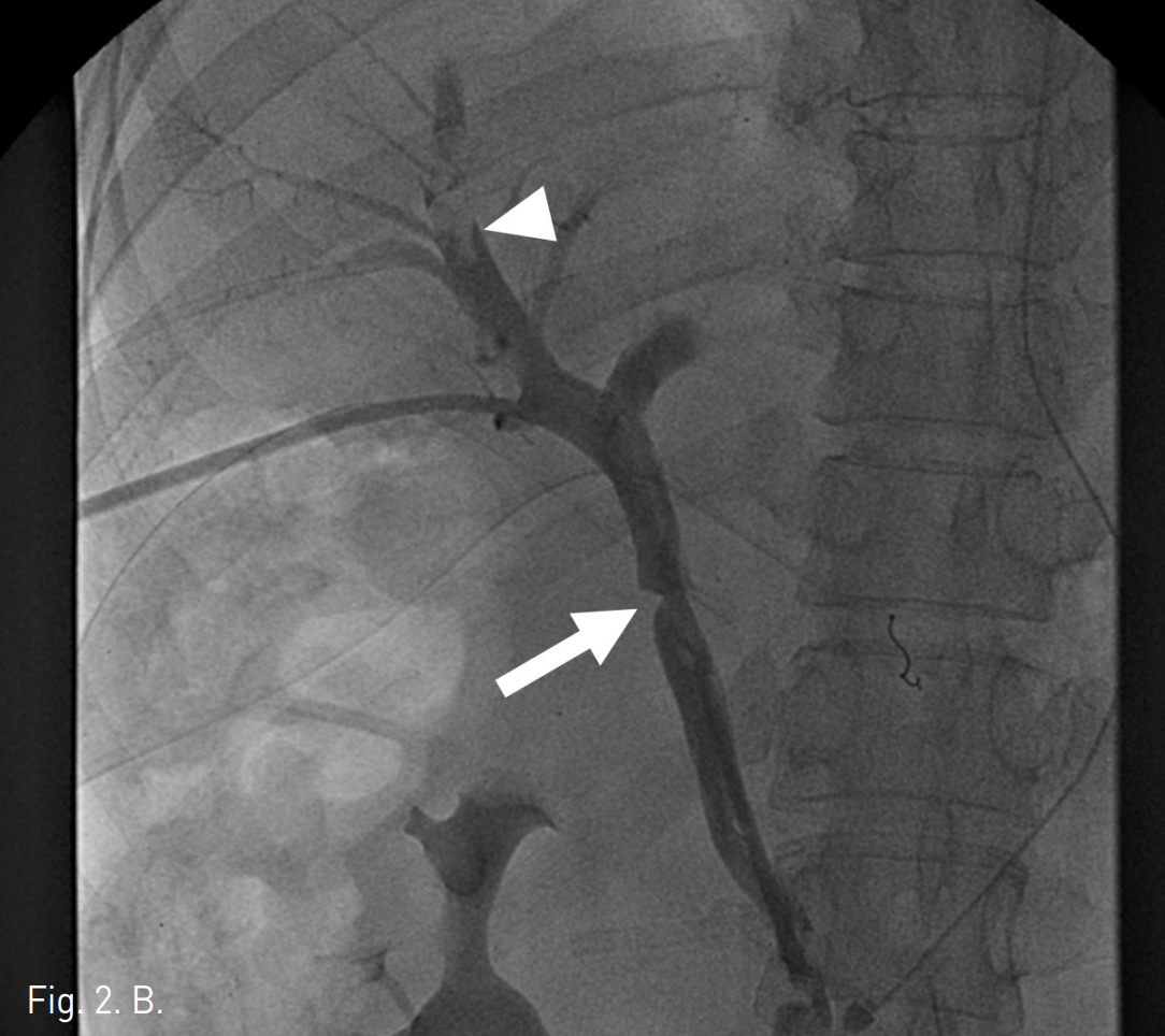 B. Portal venogram after thrombolysis and aspiration thrombectomy shows a stenosis at the graft anastomosis (arrow). A filling defect suggesting embolic thrombus (arrowhead) is noted at the intrahepatic portal vein.