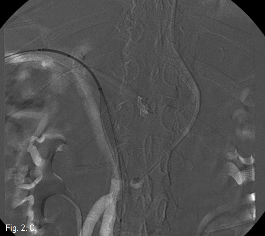 D. Post stenting portogram shows patent portal vein and superior mesenteric vein without intrahepatic embolism.