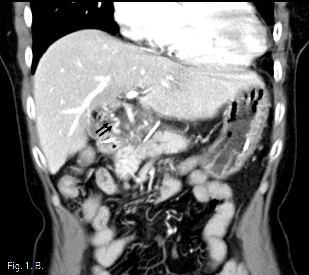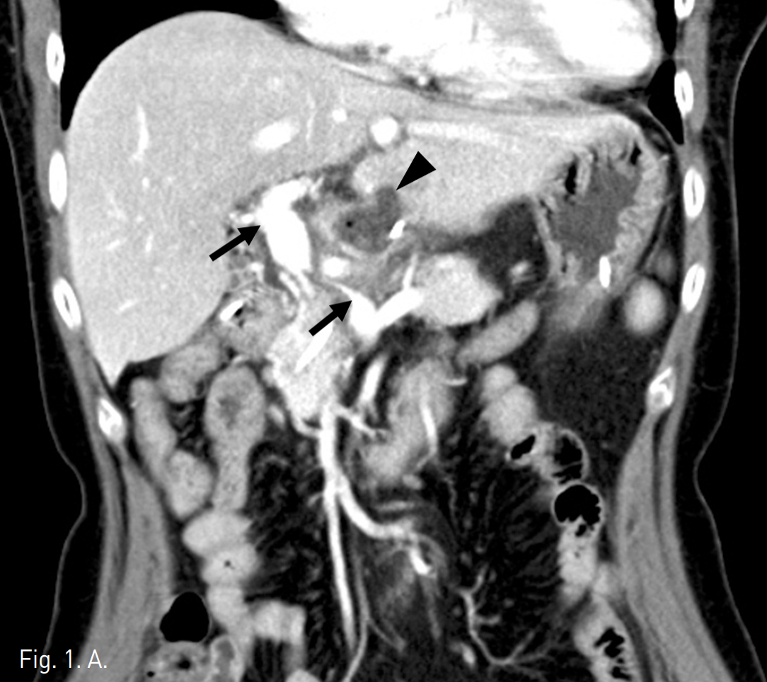 조영증강 복부 CT에서 췌장 경부 상부에 침윤성의 연부조직 음영이 보이며 3cm 정도 크기의 낭성병변이 동반되어 있음. 주문맥은 상기한 연부조직 음영으로 둘러싸여 있고 협착이 있음.주문맥 주위로 해면상변환 (cavernous transformation)이 보임(Fig 1).