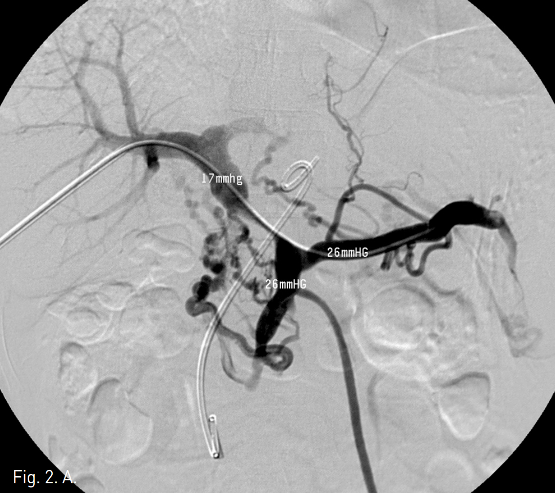 A. P6 is punctured by a 21G needle percutaneously and catheter is introduced into main portal vein. On portogram, thereis a short segmen talpor tal stenosis of 4~5cm in length and many small collateral vessels around main portal vein as cavernous transformation. Pressure gradient is 9 mmHg. (portal vein; 26mmHg, SMV and splenic vein; 17mmHg).