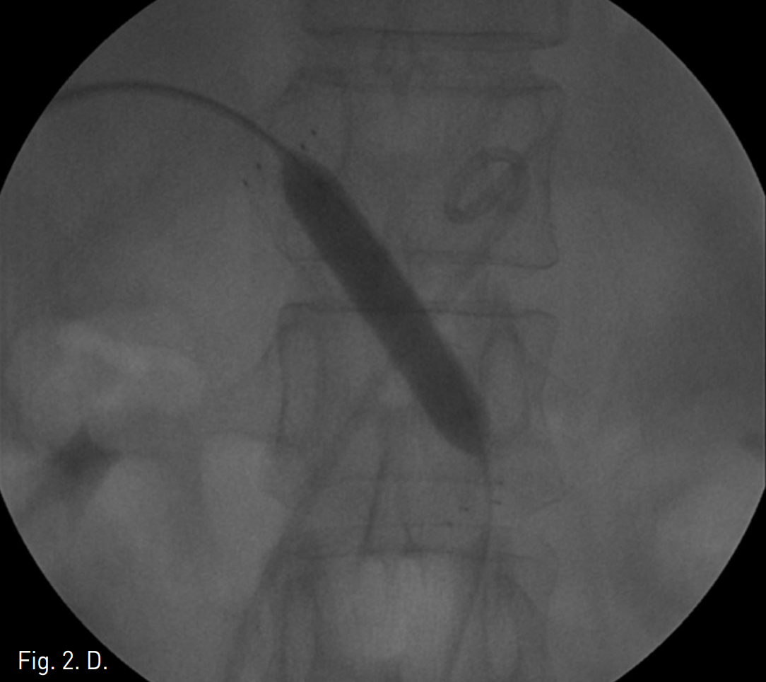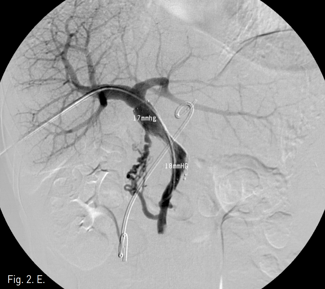 주문맥의 협착부위에서 10mm x 4cm balloon catheter (Synergy, Boston Scientific, Natick, Mass)를 사용하여 풍선확장술을 시행하였으나 elastic recoil로 인하여 반응이 없었음(Fig 2B-C). 자가팽창스텐트(14mm, 6cm, Zilver, Cook, USA)를 협착부위에 설치하고 10mm x 4cm balloon(Synergy, Boston Scientific, Natick, Mass)을 이용하여 post-stent balloon dilatation을 시행함. (Fig 2D)Stent 설치 후 협착 근위부와 원위부의 압력차는 1mmHg (SMV는 18mmHg, 주간문맥은 17mmHg)로 감소되었음(Fig 2E).