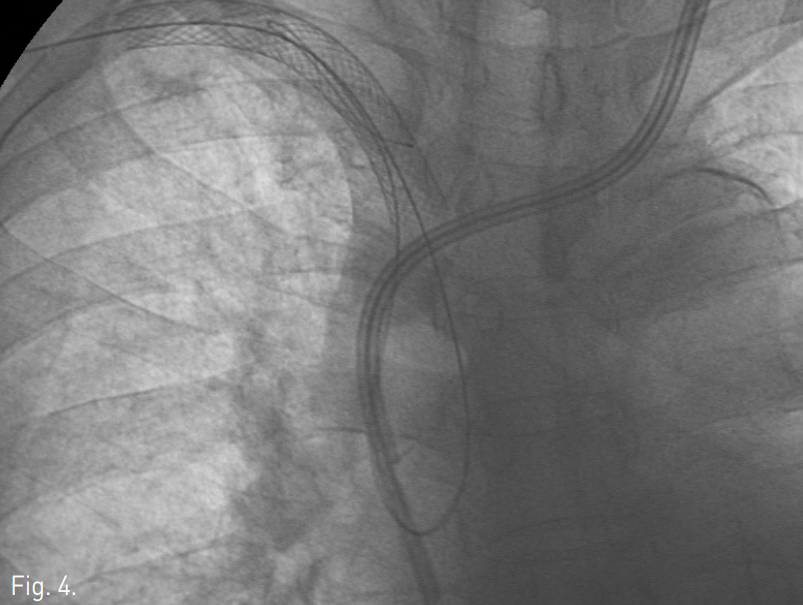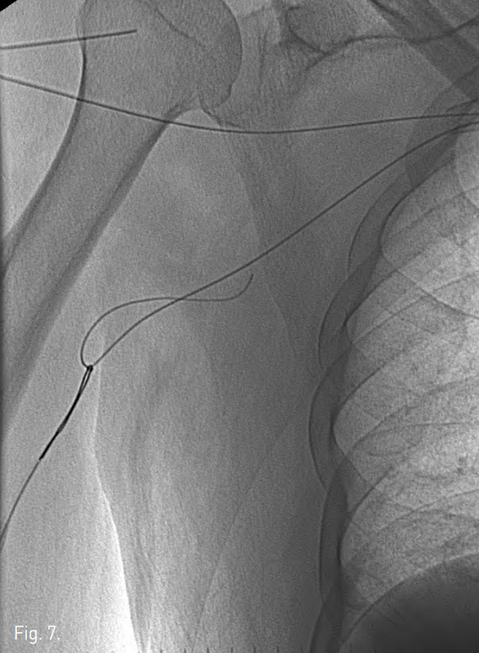 Radiographs show percutaneously placed guide wire in the SVC, which is pulled out through the femoral access.