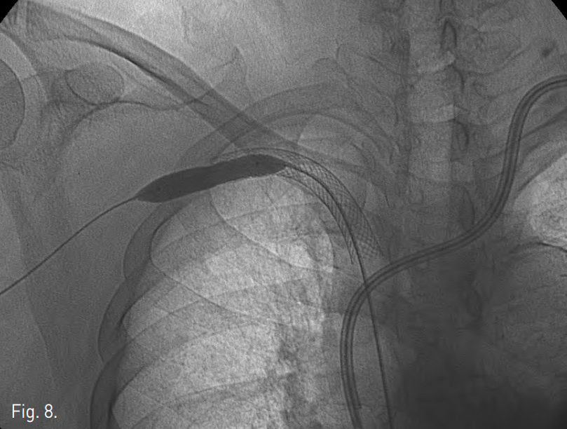 우측 동정맥루의 outflow vein을 천자하여 정맥조영술을 시행하여 쇄골하정맥 폐색을 확인한 후 5F 카테터(Cobra, Cook, Bloomington, IN, USA)와 0.035 inch 유도철사 (Terumo, Tokyo, Japan)로 폐색부위 통과를 시도하였으나 병소 부위의 저항이 심하여 실패함. 우측 대퇴정맥을 통하여 같은 방법으로 폐색부위 통과를 시도하였으나 역시 실패함. 투시와 초음파 유도하에 18G needle로 쇄골하정맥에 설치된 막혀있는 stent를 직접 천자하고(Fig. 3) 이를 통해 0.035 inch 유도철사를 삽입하여 상대정맥까지 진입시킨 후(Fig. 4), 이 유도철사를 snare catheter를 이용하여 우측 대퇴정맥 밖으로 유도함(Fig. 5). 대퇴정맥으로 나온 유도철사를 따라 직경 10mm 풍선카테터 (Cook)를 삽입하여 양측으로 나와있는 유도철사를 당겨 긴장성을 유지한 상태에서 막힌 stent내로 진입시킨 후 풍선확장술을 시행함. 풍선카테터는 제거하고 유도철사를 따라 8F guiding catheter (Cordis, Miami Lakes, FL, USA)를 일부 확장된 stent내로 진입시킨 후 양측으로 나온 유도철사를 당겨 긴장성을 유지시켜 guiding catheter가 밀리지 않게 한 상태에서 guiding catheter내로 새로운 유도철사를 삽입하여 성공적으로 막혀있는 stent를 통과시켜 상완정맥 내로 진입시킴(Fig. 6). 상완정맥 내의 유도철사를 snare catheter를 이용하여 상완 천자부위 밖으로 유도함(Fig. 7). Stent에 직접 천자하여 삽입한 첫번째 유도철사는 완전히 제거하고 상완정맥과 대퇴정맥으로 나와있는 유도철사를 당겨 긴장성을 유지한 상태에서 이를 따라 직경 10mm, 길이 4cm 풍선카테터 (Cook)를 이용하여 병소부위에 풍선확장술을 시행하고(Fig. 8), 12x80 mm Zilver stent (Cook)를 설치함. 시술 후 정맥조영술에서 쇄골하정맥은 성공적으로 개통되었고(Fig. 9), 시술 7일 후에 우측 팔의 종창은 완전히 소실되었다(Fig. 10).