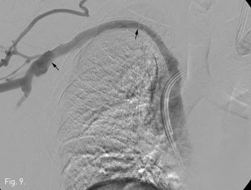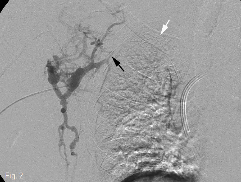 Venogram shows occlusion of the right subclavian vein (black arrow) with pronounced collateral flow 3 years after placement of a 14 x 60 mm Wallstent (white arrow).