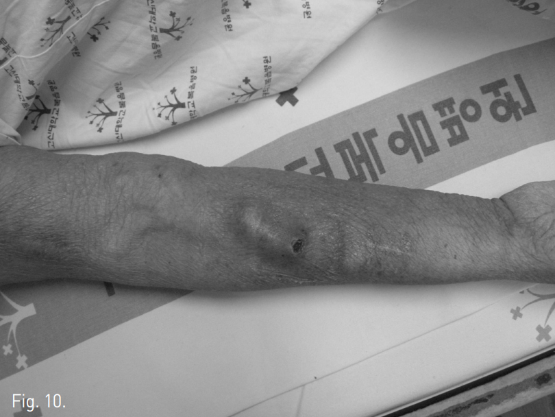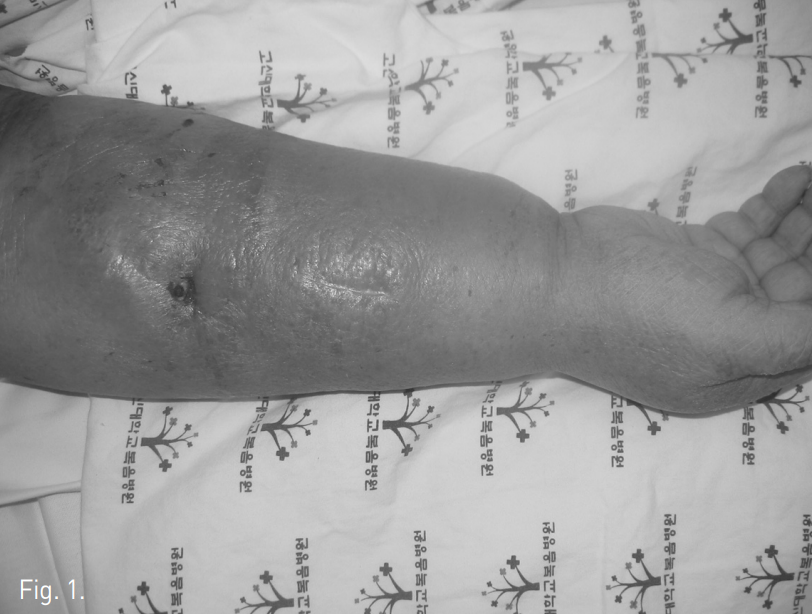 만성신부전 환자로 4년 전에 우측 팔에 동정맥루(radiocephalic arteriovenous fistula) 수술 후 혈액투석을 받아오다 3년 전에 우측 쇄골하정맥 폐색이 발생하여 직경 14mm, 길이 6cm Wallstent (Boston Scientific, MA, USA)를 설치하여 치료함. 최근 우측 팔의 종창이 심해지고 피부 궤양 및 봉와염 (cellulitis)이 발생하여 내원함(Fig. 1).