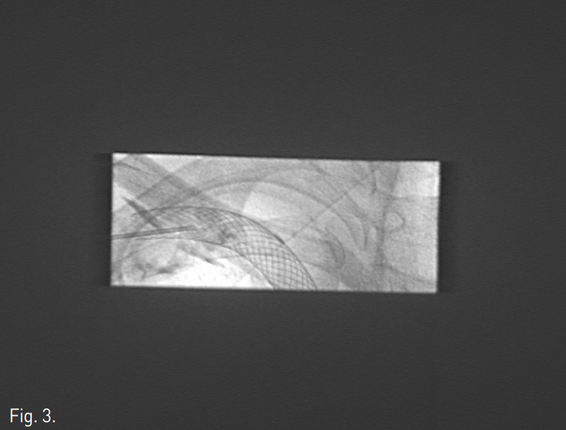 A radiograph obtained during PTA using a 10 mm balloon catheter.