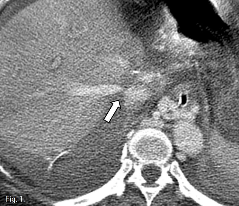 수술 후 1일 째 시행한 color doppler 검사에서 오른간 정맥의 spectral waveform이 monophasic하여 hepatic outflow의 장애가 의심되었다. Liver CT에서 오른간정맥의 기시부가 좁아져 있었으며(Fig. 1) 인접한 아래대정맥 내에 소량의 혈전이 의심되었다. 정맥조영술을 시행하였으며 오른간정맥과 아래대정맥 사이의 관강내(intraluminal) 협착 소견을 확인할 수 있었다(Fig. 2).