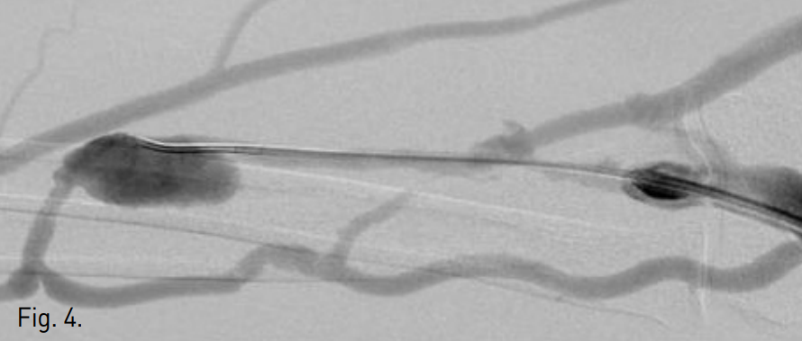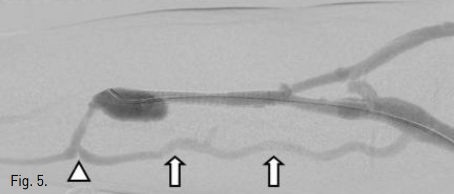 A fistulogram shows total occlusion of dis tal cephalic vein proximal to the anastomosis.