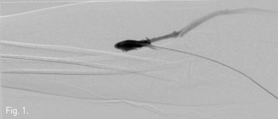 A KMP catheter is introduced proximally to the occlusion. The tip of the catheter is positioned abutting the occlusion (arrow).