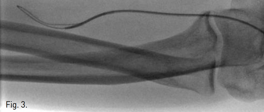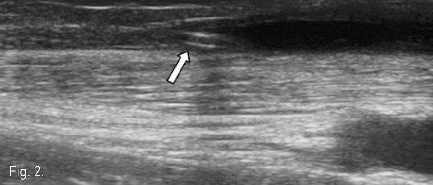 초음파 유도 하에 협착된 부위의 상부의 cephalic vein 을 천자하고 7F Sheath 를 삽입하였다. 5F KMP catheter (Cook, Bloominton, USA)를 이용하여 fistulography를 시행하여 distal cephalic vein 의 total occlusion 을 확인하였다. 초음파 유도 하에 5F KMP catheter를 occlusion 부위의 입구에 wedging 시키고(Fig. 2), 0.035" guidewire (Radiofocus, Terumo, Japan)를 이용하여 U-loop를 형성하여 동맥폐색의 재개통술에서 이용하는 subintimal dissection과 같은 방법으로 폐색부위를 통과하였다